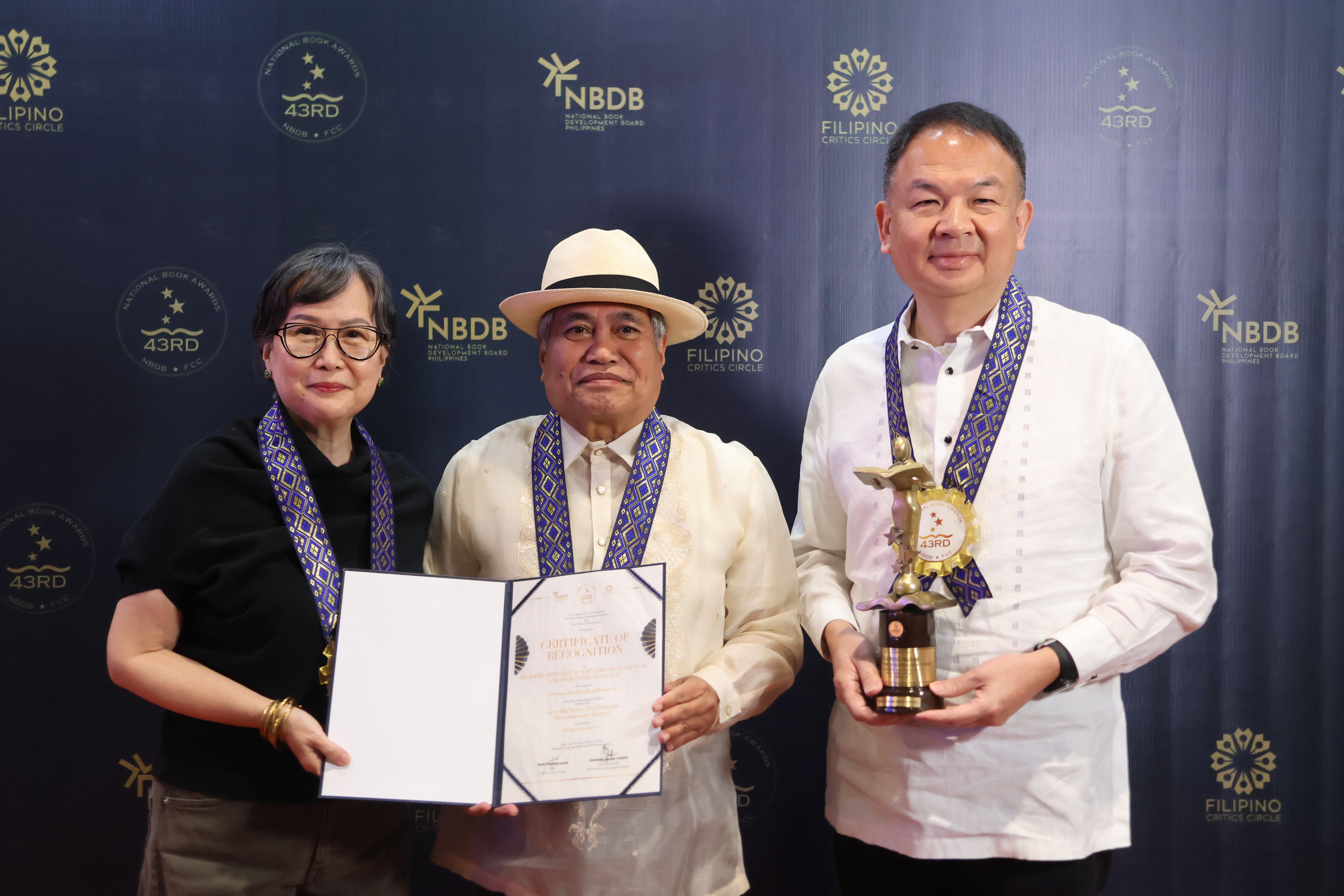 Authors Pia Benitez Yupangco, Dr. Jaime Aristotle Alip, and Lorenzo Chan Jr. proudly accepted the Best Book on Business award for “Covering Nanay” at the 43rd National Book Awards.
