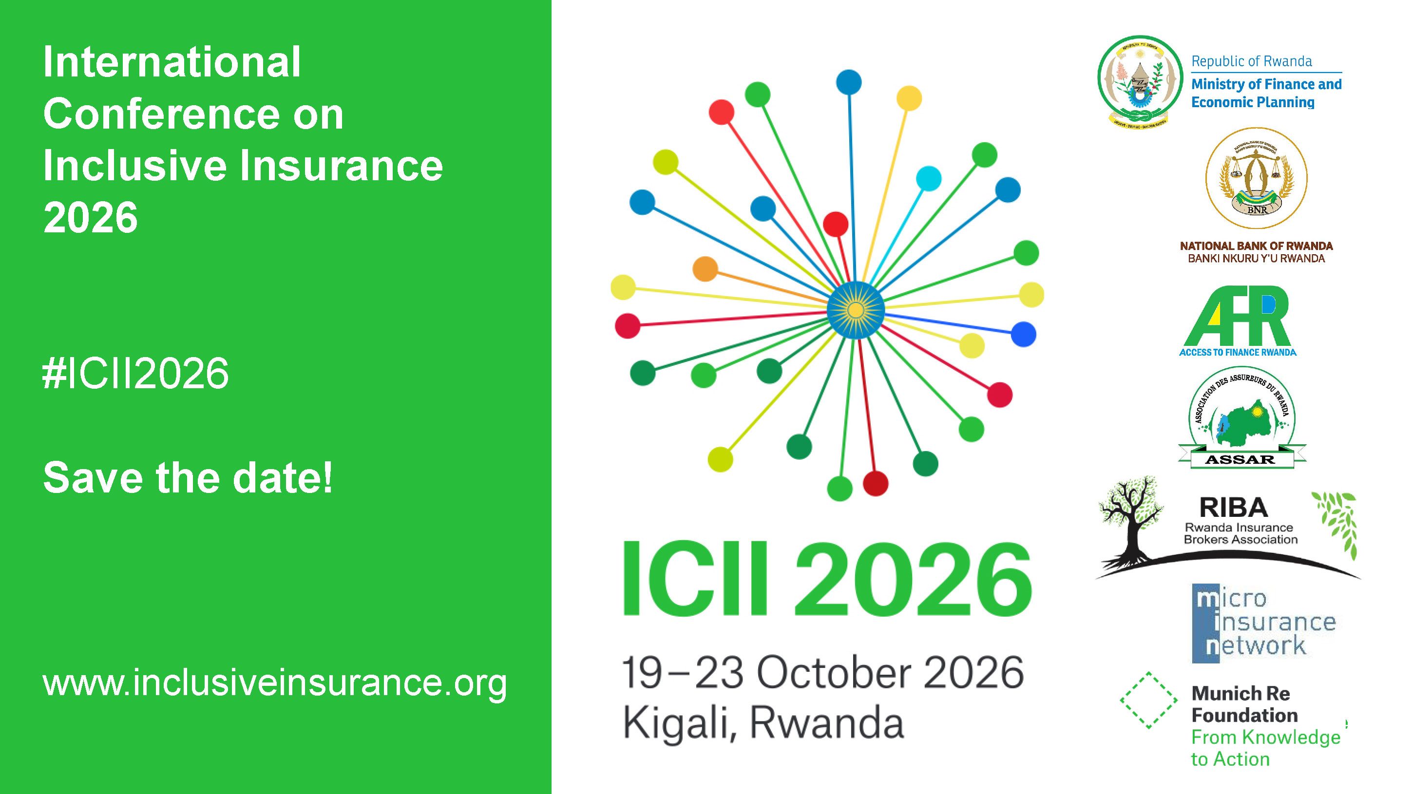 The International Conference on Inclusive Insurance 2026 (ICII 2026) will take place from 19-23 October 2026 in Kigali, Rwanda. 500+ experts from 50+ countries will discuss and identify ways of accelerating growth and economic viability in inclusive insurance for emerging markets. The conference will be hosted by the Ministry of Finance and Economic Planning (MINECOFIN), the National Bank of Rwanda (NBR), Access to Finance Rwanda (AFR), Rwanda Insurers Association (ASSAR), and Rwanda Insurance Brokers Association (RIBA) in cooperation with Munich Re Foundation and the Microinsurance Network.
